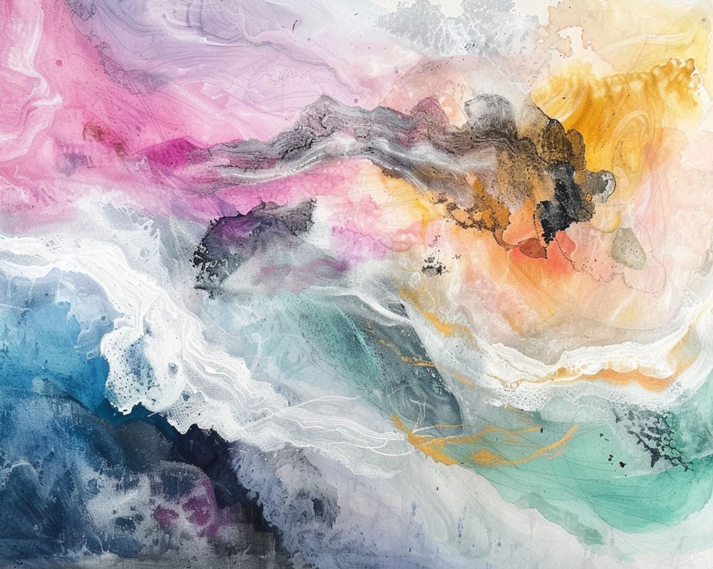 L’utilisation audacieuse de l’aquarelle sur le tableau original crée un paysage onirique qui défie les frontières traditionnelles du médium, en invitant à une contemplation poétique. L’artiste a maîtrisé l’équilibre entre la maîtrise et le lâcher-prise, permettant aux pigments de se disperser organiquement, formant des motifs qui évoquent tantôt les vagues de l’océan, tantôt les nuages au coucher du soleil. Cette pièce est un témoignage du pouvoir évocateur des couleurs et de leur capacité à évoquer des émotions et des souvenirs sans un seul mot.