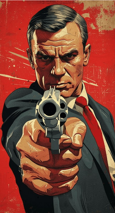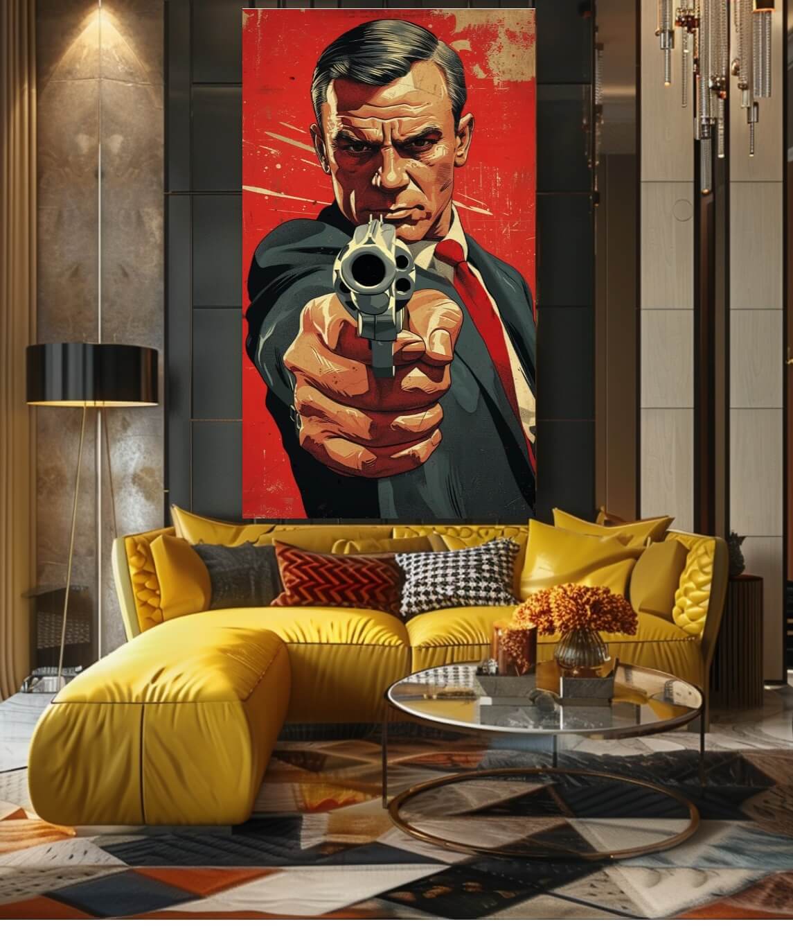 la toile de peintre de 120*100*2 cm dépeint un personnage au style graphique et affirmatif de l’acteur Sean Connery, particulièrement dans son incarnation d’un agent secret emblématique. L’homme est vêtu d’un costume classique, avec une cravate rouge et une chemise blanche, son regard est intense et fixe, dirigé droit vers le spectateur. Sa pose est emblématique et autoritaire; il tient un pistolet à bout de bras, le canon dirigé directement vers le spectateur, dans une pose qui évoque des scènes classiques de films d’espionnage.