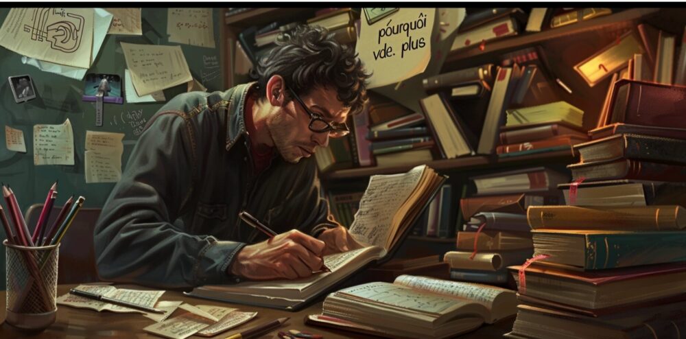 La richesse des détails — les crayons usés, les marques sur le papier, les ombres sur son visage — parle de longues heures de travail acharné. Les teintes et la texture de l’image évoquent l’atmosphère d’un sanctuaire d’étude, un lieu où le temps semble suspendu dans l’air chargé de réflexion. C’est une célébration de l’érudition, un hommage au processus d’apprentissage et de réflexion, un instantané de l’esprit en action.