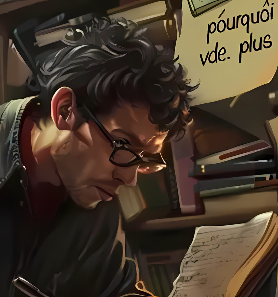 La lumière qui filtre à travers la scène souligne l’engagement singulier de l’homme envers sa tâche, éclairant sa main alors qu’elle danse sur le papier, une symphonie silencieuse de création. Il porte des lunettes, à travers lesquelles ses yeux sont concentrés, révélant une dévotion à son œuvre, un mélange de détermination et de fatigue intellectuelle.