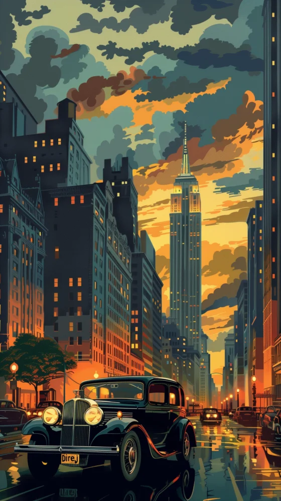 Cette image est une vision romantique et idéalisée d’une rue de New York dans le style vintage, possiblement inspirée par les années 1930 ou 1940, où le charme nostalgique se mêle à la grandeur urbaine. La palette de couleurs est saturée, offrant des teintes chaudes de jaune et d’orange qui se fondent avec les bleus profonds et les verts, capturant l’essence d’un coucher de soleil urbain qui baigne les gratte-ciels et les avenues dans une lumière dorée.