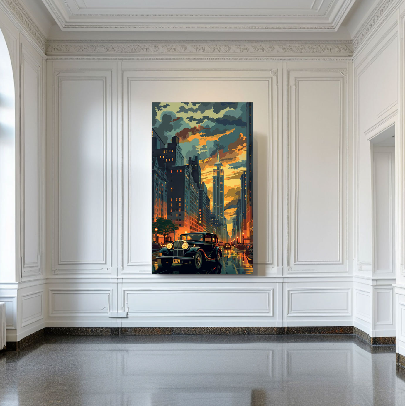 L’ensemble est un hommage à la ville de New York, à son architecture emblématique et à son énergie incessante, tout en capturant une époque révolue de glamour et de grandeur. Cette œuvre est une célébration de l’architecture, de la lumière et de l’histoire, une invitation à voyager dans le temps à travers l’art.