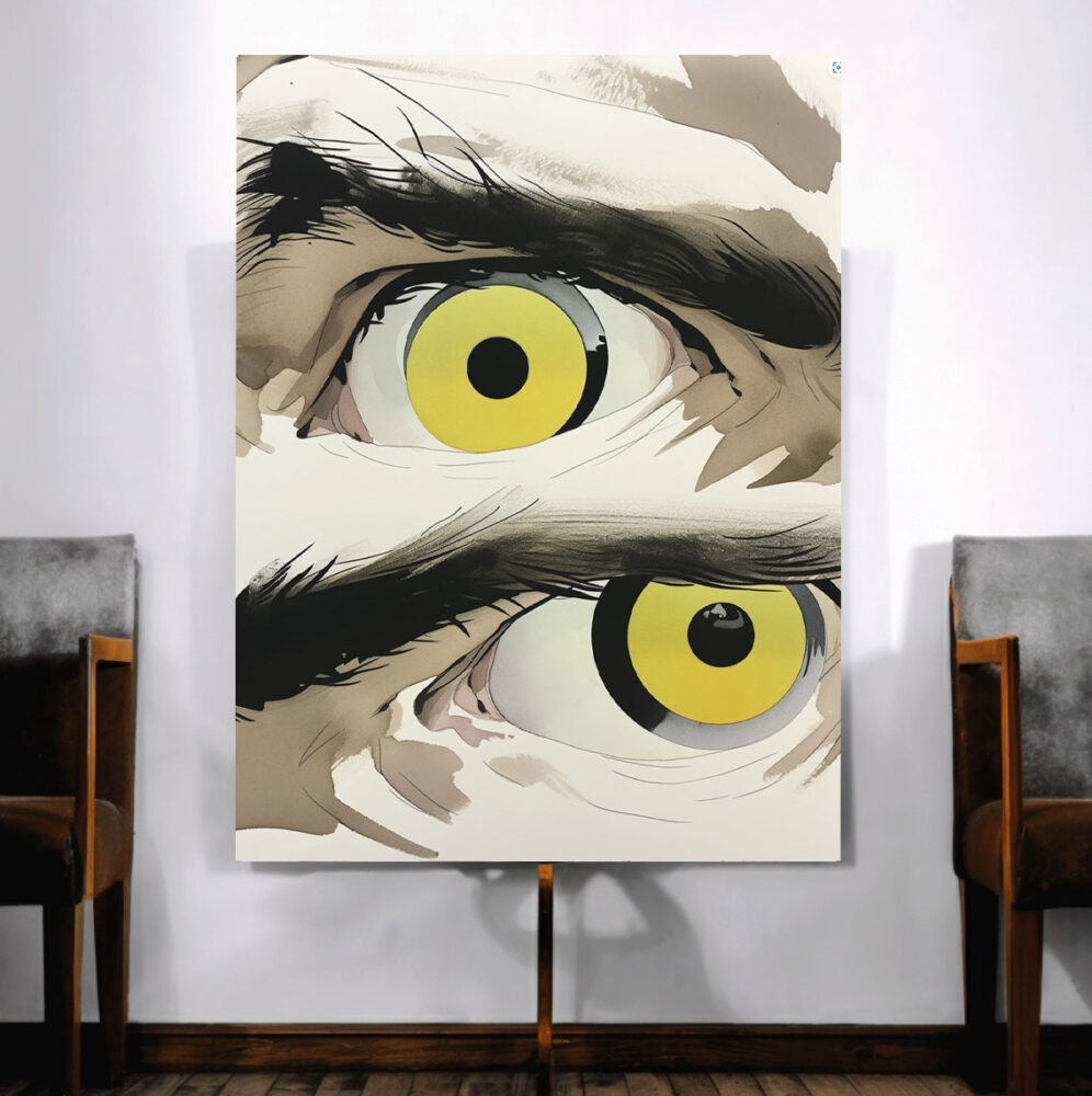 La toile nous confronte à un regard saisissant, une paire d’yeux humains capturés avec une expressivité exagérée. Les iris jaune vif sont encerclés de noir, créant un contraste saisissant qui saisit immédiatement l’attention. Cette intensité est renforcée par les larges pupilles noires, qui semblent pénétrer l’âme du spectateur. Toile de peintre80/60/2cm prête à accrocher .