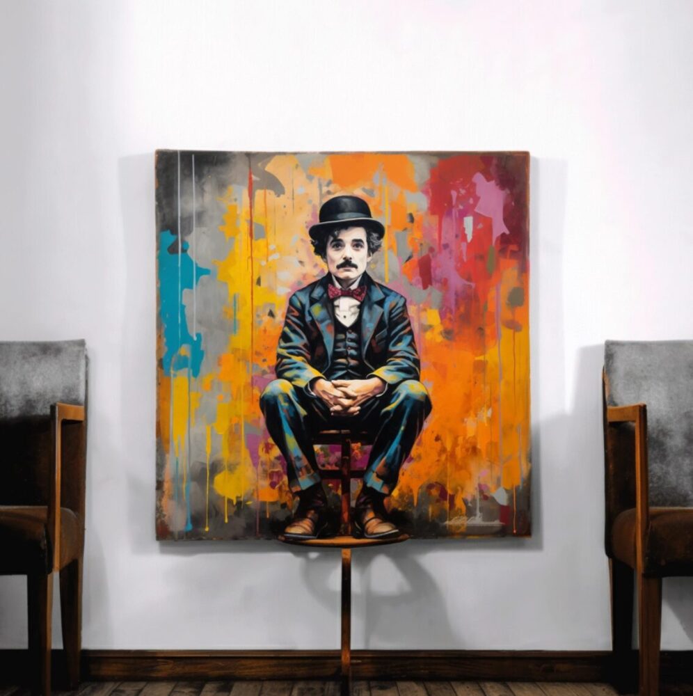 Cette toile de 100/100/2cm prête à accrocher. La toile exposée est une pièce maîtresse de modernité et de nostalgie, capturant l’effigie d’un personnage légendaire du cinéma muet Charlie Chaplin . La figure assise, reconnaissable à son chapeau melon, sa moustache emblématique et son costume rayé, est une ode au comique et au pathos qu’incarnait le personnage à l’écran. Les teintes vibrantes et expressives en arrière-plan, mélangeant des éclats de rouge, jaune, bleu, et autres, confèrent à la scène un air de graffiti, une touche de street art qui insuffle une nouvelle vie à l’icône classique.